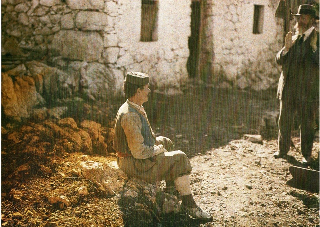 Fig. 3. Le directeur des Archives de la Planète sur l’un de ses premiers terrains. Source : Collection des Archives de la Planète, musée départemental Albert-Kahn autochrome 9×12 cm, inv A2931 (Opérateur : Auguste Léon). « Montenegro. Cettigné, un paysan assis, le bonnet avec les initiales (Kapa) », 23 octobre 1913.