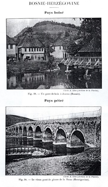 On pourrait rapprocher ces deux éléments des « emblèmes » de pays que Brunhes a utilisés dans ses travaux antérieurs pour caractériser les pays évoqués — tel le palmier à propos de l’Égypte. Mais dans ce cours consacré à la géographie de l’histoire, l’illustration intégrée au texte, tel « le vieux pont turc du seizième siècle à Mostar, sur la Narenta » (sa figure 5), vise à illustrer le « degré d’organisation politique d’un pays », car « [t]outes les toutes les fois qu’un pouvoir cherche à s’implanter dans une région nouvelle, il y trace et il y fait une route. Ce fut le sens du transcapien, du transibérien et de tous les “trans” continentaux » (Brunhes, 1914, p. 54).