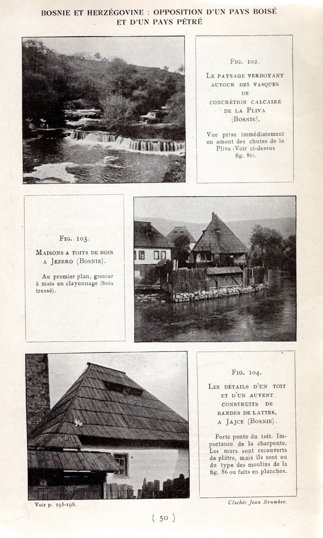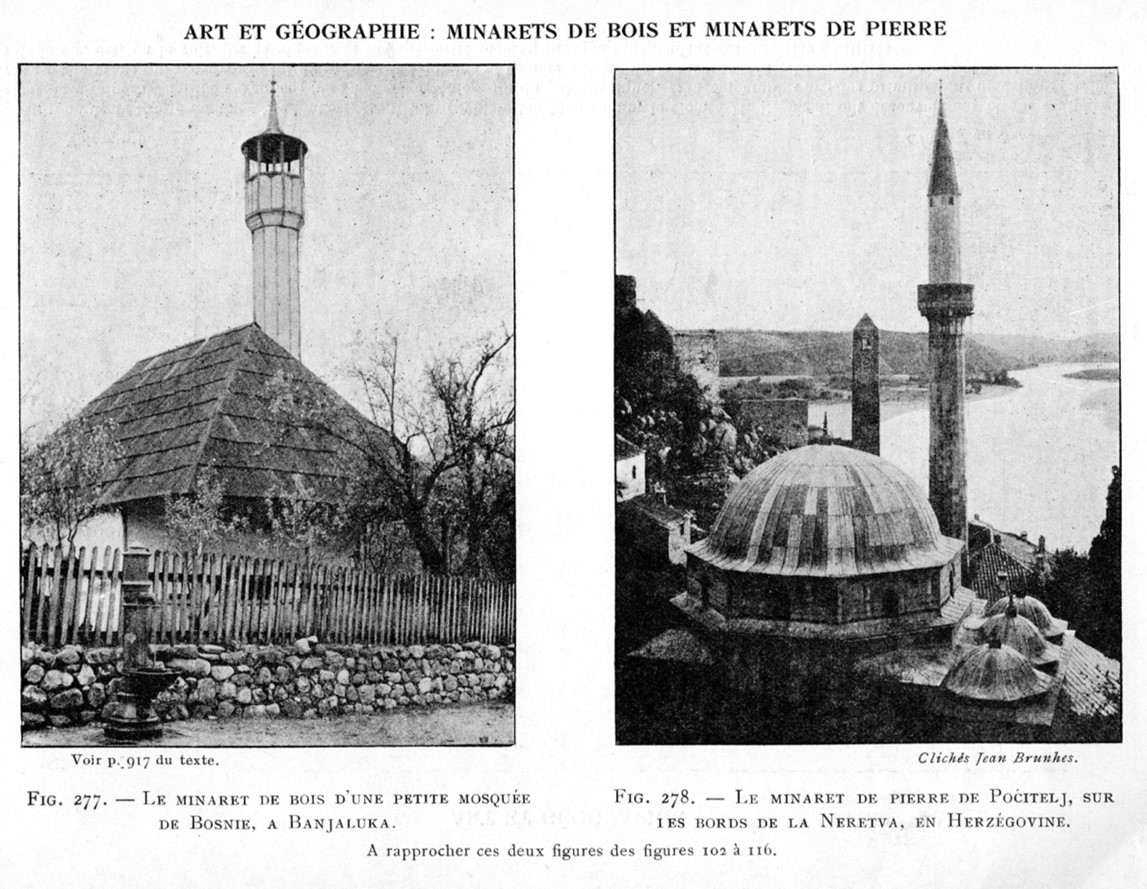 Il en est ainsi des photographies des mosquées de Banjaluka (Bosnie) et de Pocitelj (Herzégovine) que Brunhes a évoquées dès son cours inaugural du Collège de France de 1913 pour concrétiser son programme en analysant le cas de la Bosnie-Herzégovine, qu’il a visitée quelques mois auparavant. Reprenant l’année suivante ces propos en tête d’un cours sur la géographie de l’histoire, il fait figurer successivement deux photographies en insistant sur la différence de matière et de forme des minarets de Bosnie et d’Herzégovine, pour rappeler les relations unissant les faits essentiels de la géographie humaine au substrat naturel du pays : « On doit spécialement insister sur l’opposition entre le minaret de bois et le minaret de pierre ; le minaret de bois appartient par excellence à la région boisée c’est-à-dire à la région boisée, c’est-à-dire aux zones bosniaques : il se trouve un peu partout dans les villages de la Bosnie, et il apparaît même encore dans la grandes villes ; il est non seulement caractérisé par les matériaux employés, mais par la forme que ces matériaux imposent aux constructeurs. […] le minaret de pierre appartient à la zone herzégovienne de la pierre ; il est dans son domaine géographique naturel, et, en une certaine mesure, il le représente avec exactitude. » (Brunhes, 1914, p. 3).