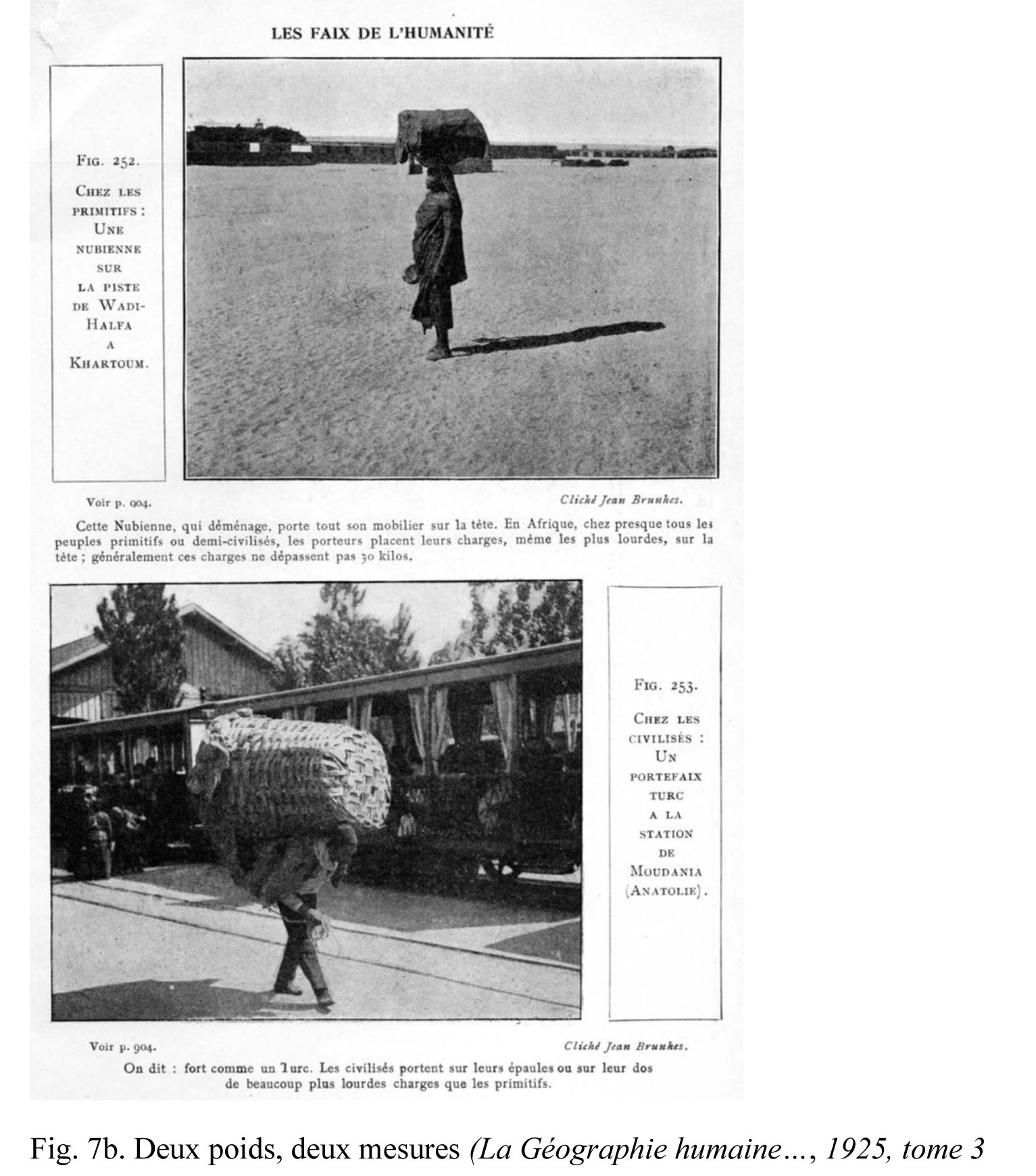 À 13 ans de distance, la deuxième et la troisième éditions de la Géographie humaine…, présentent ainsi la photographie d’une femme portant un fardeau sur la tête, immobile dans un espace désertique ponctué de quelques tentes et fermé au loin par une petite bourgade (Fig. 7a). En 1912, elle est associée sous un titre vague (« Retentissement des faits proprement humains [dans l’ordre des faits géographiques] ») et peu cohérent avec le couple iconographique, à la photographie d’une barraque de la « zone » non aedificandi entourant Paris, avec ses habitants, un jardin et des palissades en bois, et elle est assortie de la légende suivante : « Comment l’on porte chez la plupart des peuples à demi sauvages ou primitifs – Sur la piste de Wadi-Halfa à Khartoum » et d’un commentaire neutre : « Cette Nubienne qui déménage porte tout son mobilier sur la tête. »